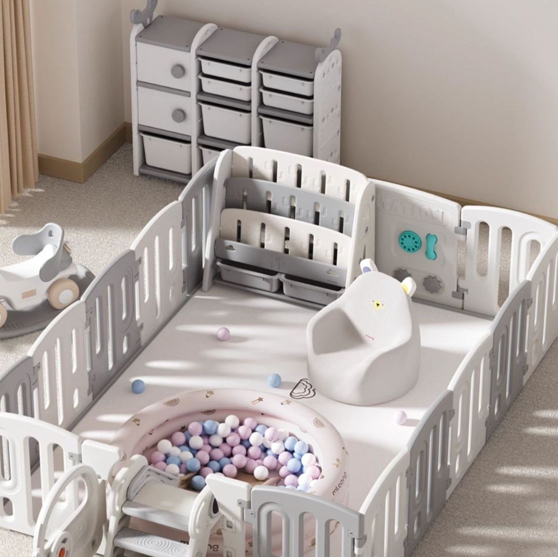 複数のパネルを組み合わせて広々とした空間を作れるので、おもちゃを置いてのびのび遊べます。